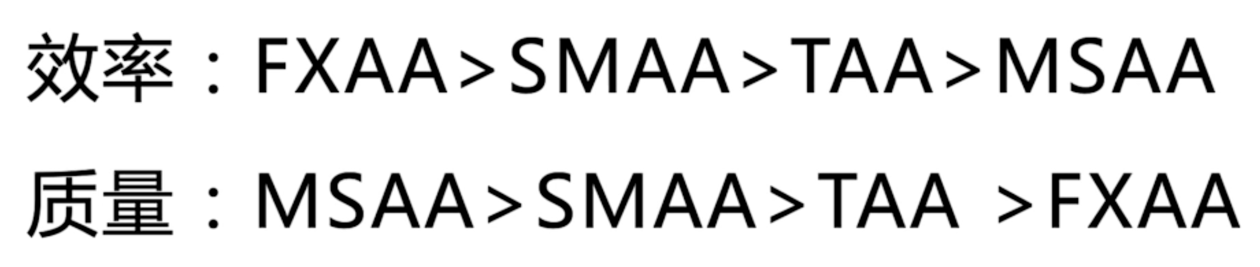 第一代:SSAA(超级采样抗锯齿Super-Sampling Anti-Aliasing) 第二代:MSAA(多重采样抗锯齿Multi Sampling Anti-Aliasing)、 FXAA(快速近似抗锯齿Fast Approximate Anti-Aliasing)、 SMAA(增强子像素形变抗锯齿Enhanced Subpixel Morphological Anti-Aliasing) 第三代:TAA(时间序列抗锯齿TemporalAnti-Aliasing) 第四代:DLSS(基于深度学习的超级采样DeepLearning Super Samplingg)