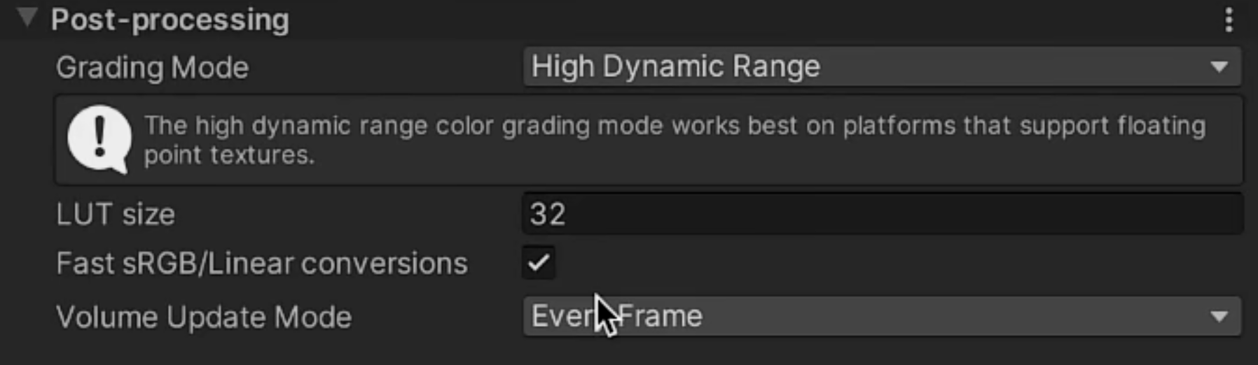 如果是支持浮点精度纹理的平台或设备,Color Grading的HDR模式效率会更高。比如苹果就支持,那么GradingMode选项就可以改为HDR,LUT设置为32