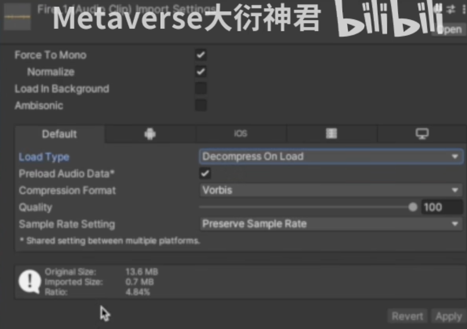 Q: 部分音频文件为什么要采用 Force To Mono? A:因为游戏采用的是双声道音频,有些音频左右声道的信息完全一样,所以可以采用该选项 改成单声道 进行优化 Q: 如何选取音频的压缩格式? A: 通常采用wav文件作为音频源文件,然后根据不同平台支持格式,对音频进行压缩处理,控制压缩比 多数音频采用Vorbis压缩格式进行压缩,如果音乐不打算循环,还可以采用mp3压缩格式进行压缩,某些平台对特定压缩格式有优化 如IOS的MP3。 也可以使用ADPCM压缩格式,这种格式压缩比虽然不够好,但是播放的解码速度很快 PCM格式为未压缩格式