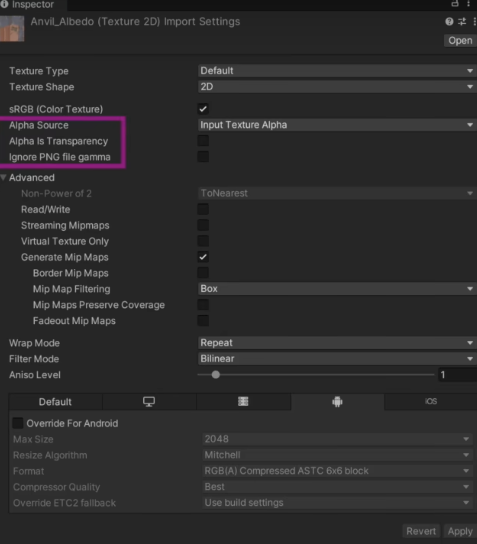 - Read/Write 开启此选项会使得纹理内存使用量增加一倍 默认选择lnput Texture Alpha就好,如果确定不使用原图中的Alpha通道,可以选择None.另外From Gray Scale我们一般不会选用