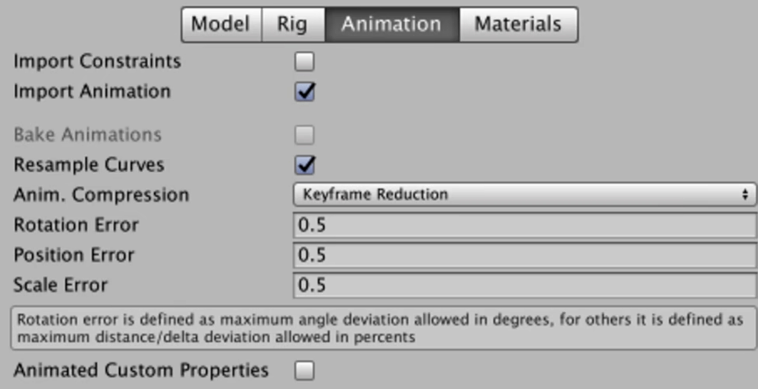 - Resample Curves 将动画曲线重新采样为四元数值,并为动画每帧生成一个新的四元数关键帧,仅当导入动画文件包含欧拉曲线时才会显示此选项